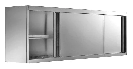 WANDHÄNGESCHRANK MIT SCHIEBETÜREN. Aus CNS 18/10, 4-seitig geschlossen, mit einem höhenverstellbarem Zwischenfach und frontseits Schiebetüren mit Antidröhnmatte.