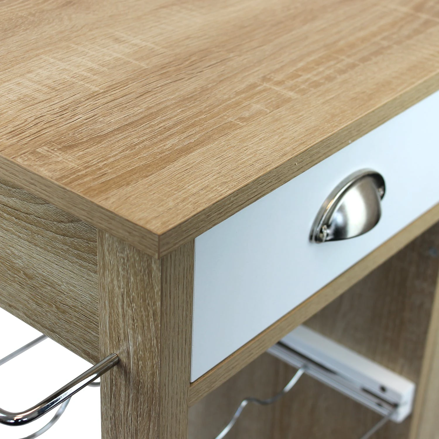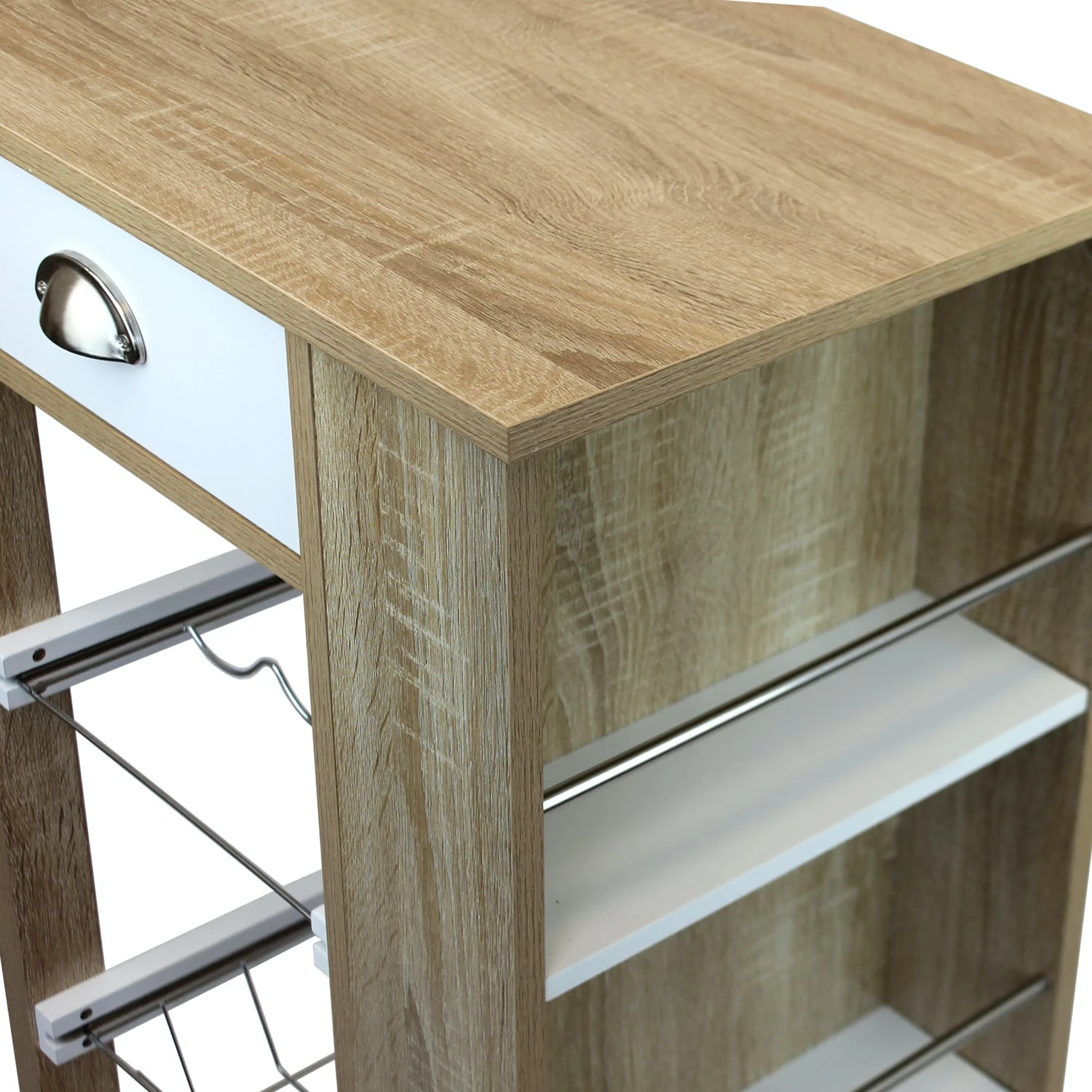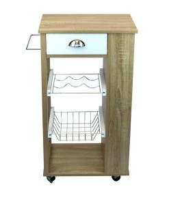 Dieser praktische Küchenwagen ist der ideale Helfer. Dank seiner vielseitig ensetzbaren Ablageflächen und seiner Beweglichkeit, ist er universell verwendbar. Der Servierwagen verfügt über eine herausnehmbare Flaschenablage für bis zu 3 Flaschen. Dazu an seiner Seite über genügend Stauraum für Gläser und oder andere Utensilien. Mit seiner Schublade und Metallkorb bietet er weitere zusätzliche verwendungsmöglichkeiten.