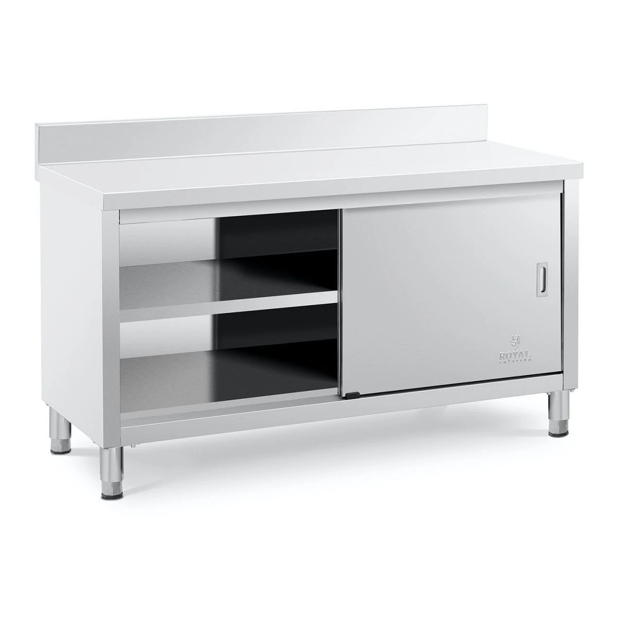 Bis zu 600 kg! Das Kraftpaket unter den Arbeitsschränken Edelstahlmöbel sind die Grundlage für eine saubere Küche und den hygienischen Umgang mit Lebensmitteln aller Art. Der Arbeitsschrank von Royal Catering wurde speziell für die hohen Anforderungen in der Gastronomie entworfen.Die 150 x 60 cm große Arbeitsoberfläche des Edelstahlschranks bietet jede Menge Platz für Ihre tägliche Arbeit mit frischen Lebensmitteln, Zutaten und Küchengeräten. Die Kombination aus Arbeitsfläche und Aufbewahrungsschrank ermöglicht vielfältige Einsatzmöglichkeiten und sorgt für Ordnung in Ihrer Küche. Ausgestattet mit zwei praktischen Schiebetüren, empfiehlt sich der Arbeitsschrank vor allem in engen Küchen.Der Innenraum ist durch einen stabilen Einlegeboden unterteilt. Er kann ebenso wie die untere Ablagefläche und die Arbeitsfläche mit bis zu 200 kg belastet werden. Dies ergibt eine Gesamttragkraft des Arbeitsschranks von maximal 600 kg. Optimale Stabilität erlangt der 85 cm hohe Arbeitsschrank auch bei unebenen Böden mithilfe der vier höhenverstellbaren Füße. Die 10 cm hohe Aufkantung schließt den Spalt zwischen Arbeitsfläche und Wand. Dadurch wird verhindert, dass die Wand durch Spritzer oder sonstige Verschmutzungen verunreinigt wird oder etwas zwischen Schrank und Wand fällt.Technische DetailsMaterial: EdelstahlBelastbarkeit max.: 600 kgBelastbarkeit pro Ebene max.: 200 kgMaße Arbeitsfläche (LxB): 150 x 60 cm Anzahl Schiebetüren: 2 Anzahl Ebenen: 3 (inkl. Arbeitsoberfläche)Füße höhenverstellbar: JaAufkantung: 10 cmLieferumfangArbeitsschrank RCSSCB-150×60-E-B, Montagezubehör, Bedienungsanleitung