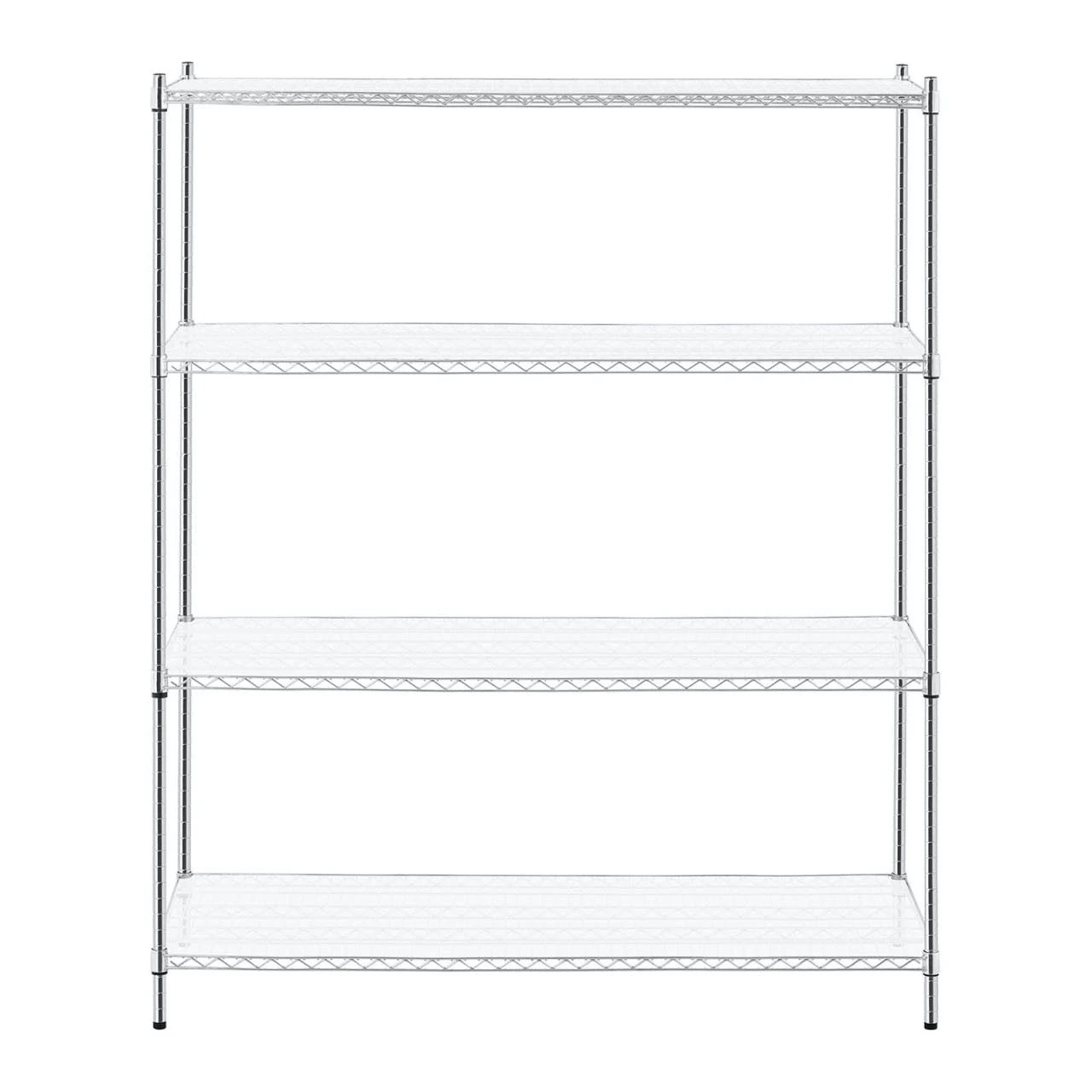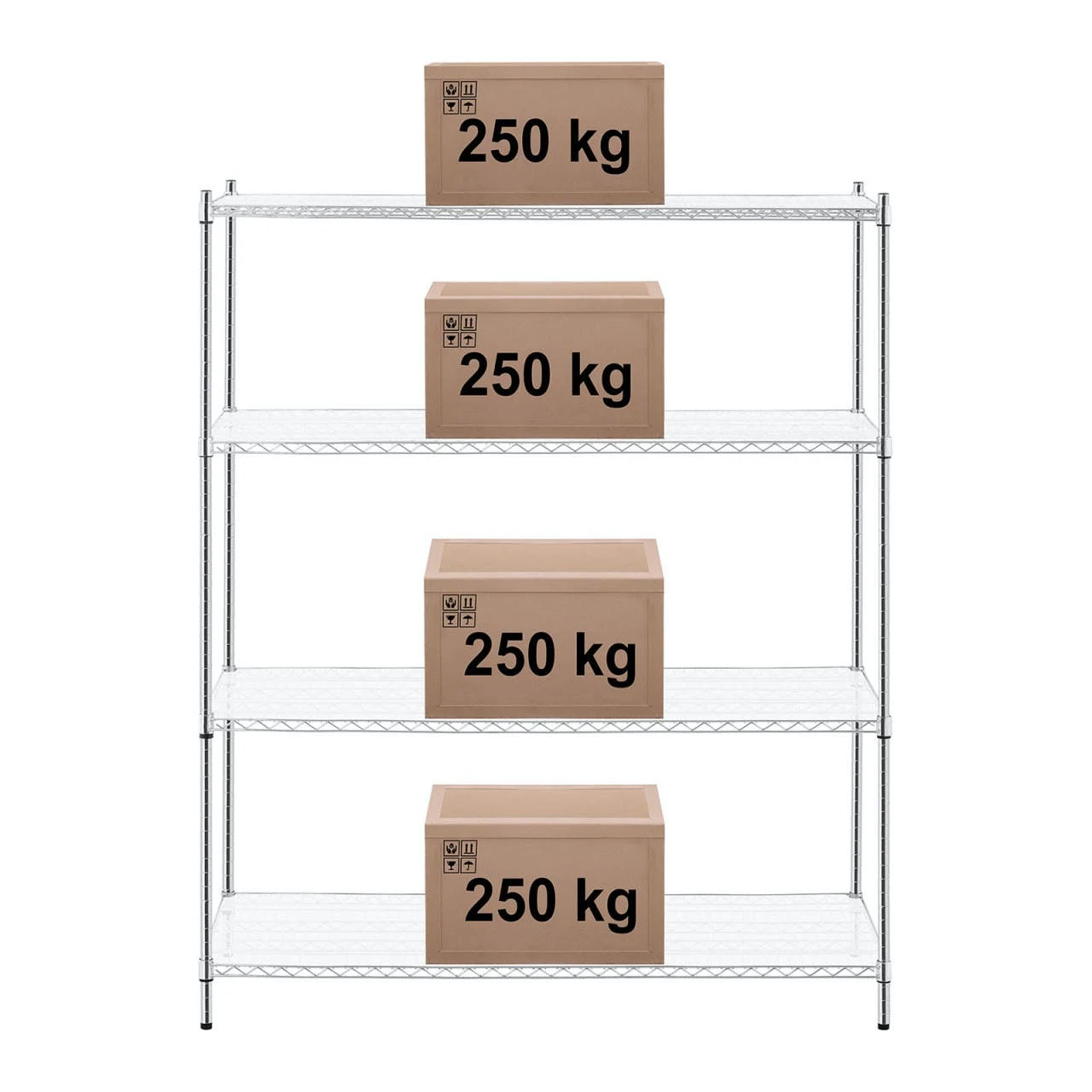 Das geräumige Lagerregal aus Stahl verfügt über vier je 150 x 60 cm große Stahlgitterböden mit Kunststoffmatten und garantiert so jede Menge Ablagefläche: ob in Hotel, Werkstatt, Restaurant oder Supermarkt ebenso wie Zuhause in Garage, Küche oder Keller. Jede der Ebenen ist mit bis zu 250 kg belastbar, wodurch die Gesamtbelastung maximal 1.000 kg beträgt. Die Kunststoffmatten ermöglichen auch die problemlose Lagerung kleinteiliger Elemente, ohne die Gefahr, dass diese durch das Gitter rutschen. Zudem sind die Matten leicht zu entfernen und zu reinigen.